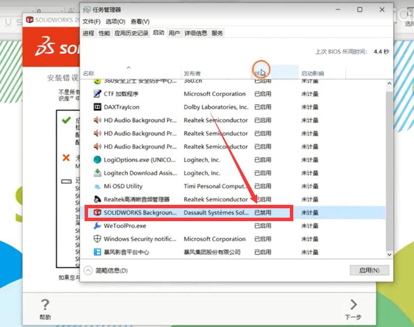 打开任务管理器,禁止solidworks Back... 禁止后一定要重新启动电脑,然后重装SW即可。
