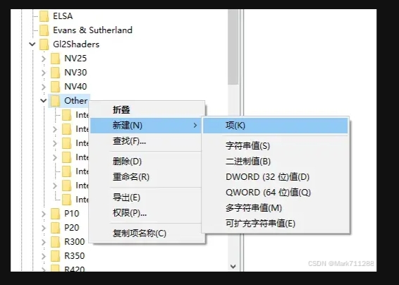 2. 展开"GI2Shaders",右键"Other",选择新建"项",重命名为复制的显卡名称;然后再刚刚新建的显卡名称项上右键,再新建"DWORD (32位)值",重命名为"Workarounds",编辑数值为"4000000"。