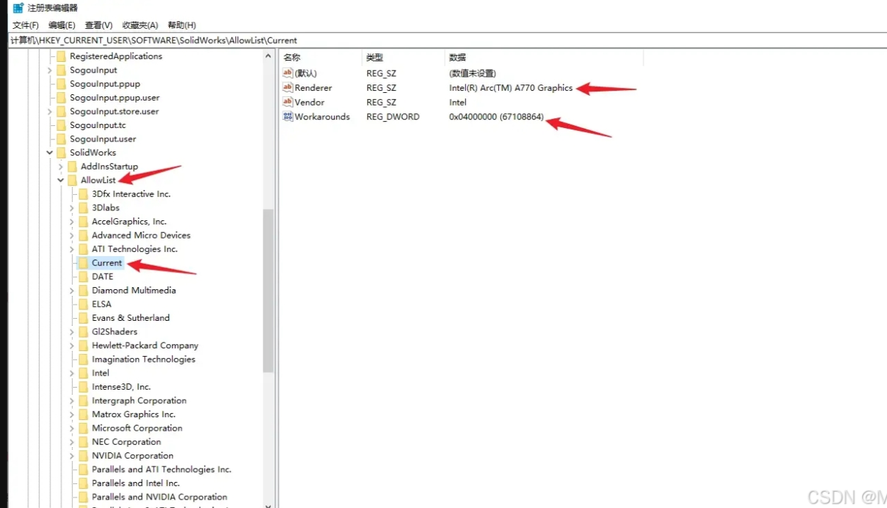 1. win+R,输入CMD,在电脑命令行模式下输入“regedit”,打开注册表。定位到:HKEY_CURRENT_USER\SOFTWARE\SolidWorks\AllowList。查看当前显卡信息,选中"Current",显卡信息显示在右侧,需要添加的注册表即当前显卡的信息。双击"Renderer",复制数值数据(显卡名称);然后双击"Workarounds",修改数值数据为"4000000"。