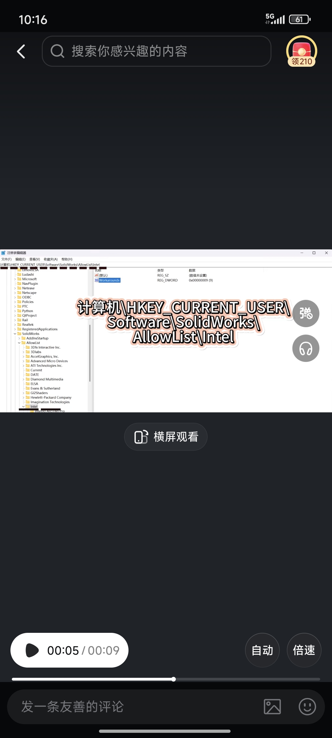 修改注册表“HKEY_CURRENT_USER\SOFTWARE\SolidWorks\SOLIDWORKS 2022\Performance\Graphics\Hardware\Intel 里面的Workarounds ”改为9(有的说是4000000)