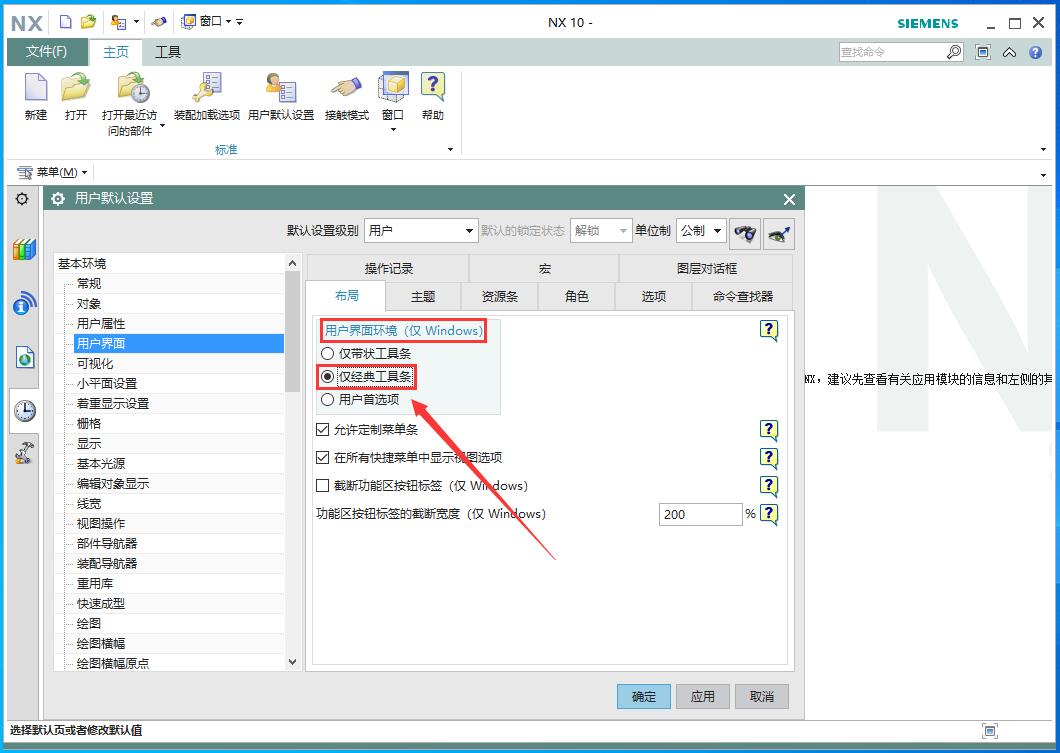 ug10.0怎么改成经典界面? ug10.0改成经典界面教程 1、首先打开UG10.0,不要新建文件 2、点击用户默认设置 3、选择“用户界面”-“布局” 4、在“用户界面环境”中选择“仅经典工具条”选项;选好后单击确定,弹出的对话框继续单击确定 5、点击确定6、点击确定7、退出UG软件,重新打开。新建模型文件,可以看到界面已经变化 赞 赏 分享 您可以选择一种方式赞助本站 支付宝转账赞助 微信转账赞助 分享到各大网站