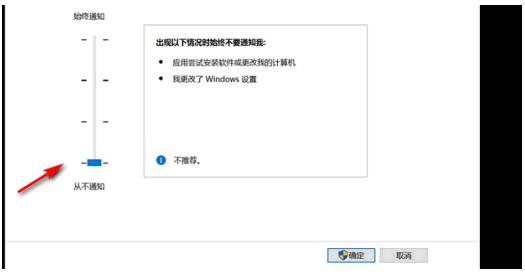 5、将用户账户控制设置改为“从不通知”,点击确定。