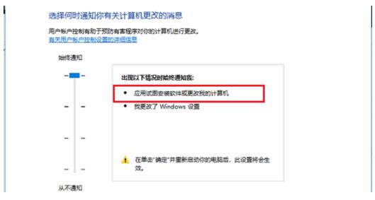 4、在用户账户控制设置界面中,可以看到“应用试图安装软件或更改我的计算机”这项为“始终通知”,这就是造成每次打开软件都弹出提示窗口的原因。