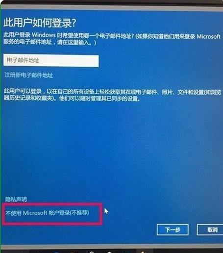 3、在“此用户如何登录”对话框里选择左下角“不使用Microsoft账户登录(不推荐)”,然后下一步。