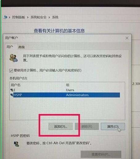 2、进入“用户账户”之后,就可以看到已存的用户,这时可以点击“添加”。