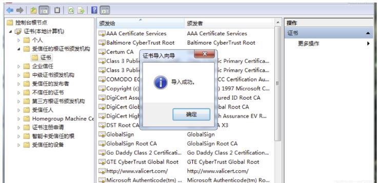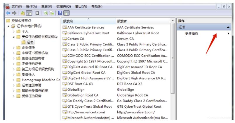5.回到控制台主窗口,依次展开:证书 → 受信任的根证书颁发机构 → 证书,单击更多操作的小箭头,选择所有任务 → 导入;接下来选择步骤1中下载好的cer证书文件,然后一直点击下一步,导入成功即可。