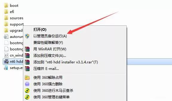 3.解压完毕后,将系统工具中nt6 hdd installer v3.1.4.exe文件复制到解压后的目录中,选择右键以管理员的方式运行。