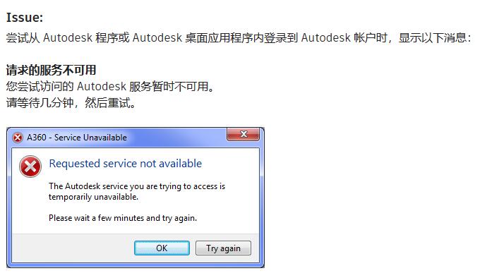 启动 Autodesk 程序或登录 Autodesk 桌面应用程序时显示“请求的服务不可用”