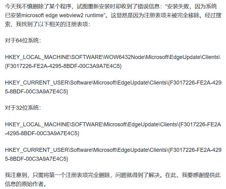 今天我不慎删除了某个程序,试图重新安装时却收到了错误信息:“安装失败,因为系统已安装microsoft edge webview2 runtime”。这显然是因为注册表项未被完全移除。经过搜索,我找到了以下相关的注册表项:对于64位系统:HKEY_LOCAL_MACHINE\SOFTWARE\WOW6432Node\Microsoft\EdgeUpdate\Clients\{F3017226-FE2A-4295-8BDF-00C3A9A7E4C5}HKEY_CURRENT_USER\Software\Microsoft\EdgeUpdate\Clients\{F3017226-FE2A-4295-8BDF-00C3A9A7E4C5}对于32位系统:HKEY_LOCAL_MACHINE\SOFTWARE\Microsoft\EdgeUpdate\Clients\{F3017226-FE2A-4295-8BDF-00C3A9A7E4C5}HKEY_CURRENT_USER\Software\Microsoft\EdgeUpdate\Clients\{F3017226-FE2A-4295-8BDF-00C3A9A7E4C5}我注意到,只需将第一个注册表项完全删除,问题就得到了解决。在此,我要感谢提供此信息的原始作者。