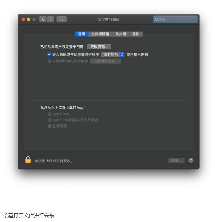 接着打开【系统偏好设置】,选择【安全性与隐私】,选择【通用】,可以看到【任何来源】已经选定。