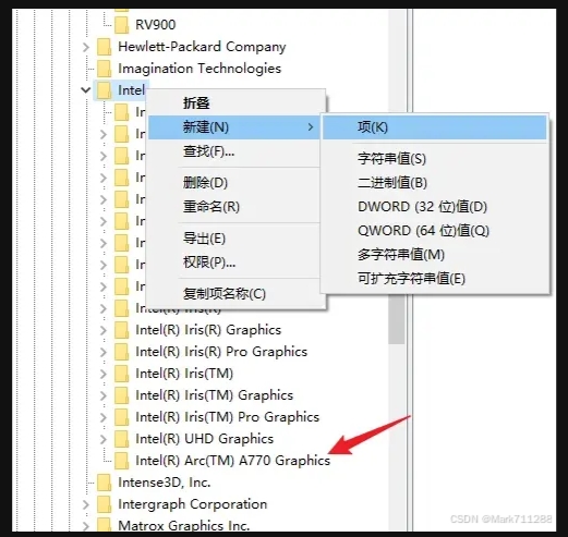 3. 同样在"Intel"下新建"项",重命名为复制的显卡名称,同样再新建一个数值为"4000000"的"Workarounds"。