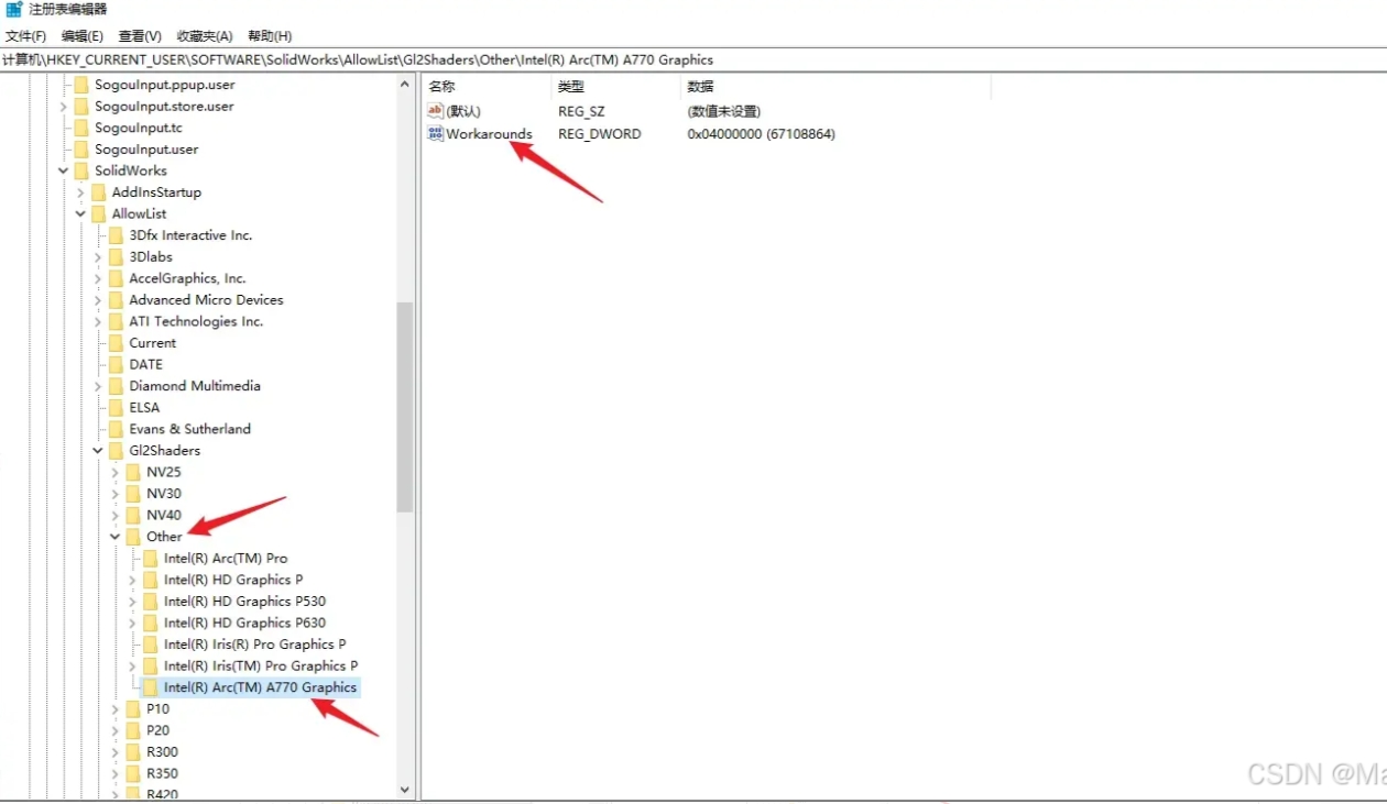 2.依次导航至以下路径:HKEY_CURRENT_USER\Software\SolidWorks\SolidWorks 20xx\Performance\Graphics\Hardware\Intel (其中“20xx”代表您安装的SolidWorks版本号)。点击intel,双击Workarounds,修改值为4000000。再打开sw,发现性能中openGL已可以勾选