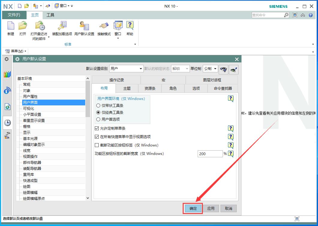ug10.0怎么改成经典界面? ug10.0改成经典界面教程 1、首先打开UG10.0,不要新建文件 2、点击用户默认设置 3、选择“用户界面”-“布局” 4、在“用户界面环境”中选择“仅经典工具条”选项;选好后单击确定,弹出的对话框继续单击确定 5、点击确定6、点击确定7、退出UG软件,重新打开。新建模型文件,可以看到界面已经变化 赞 赏 分享 您可以选择一种方式赞助本站 支付宝转账赞助 微信转账赞助 分享到各大网站