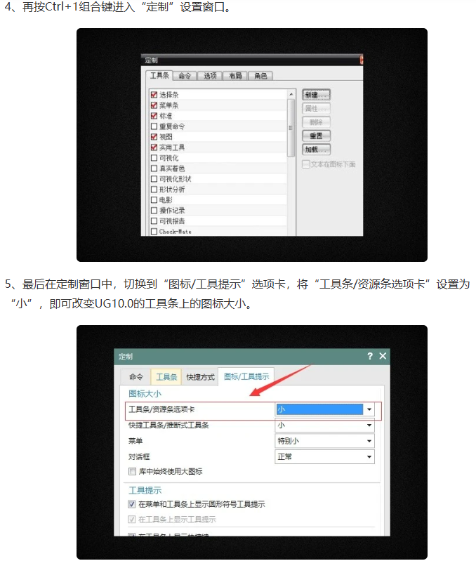 NX软件菜单—工具—定制(或者直接按键盘上的快捷键Ctrl+1)。 2、图标/工具提示—图标大小—功能区—调整你要的图标大小。