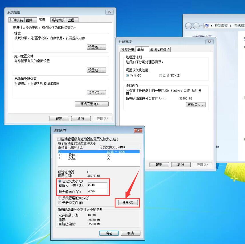 5、在弹出的窗口中取消勾选“自动管理所有驱动器的分页文件大小(A)”,然后选择要设置虚拟内存的盘符,勾选“自定义大小”,在设置了合适的虚拟内存大小后点击设置,最后点击确定完成设置操作。这里的具体磁盘以及大小,大家根据自己的需要来划分哦!