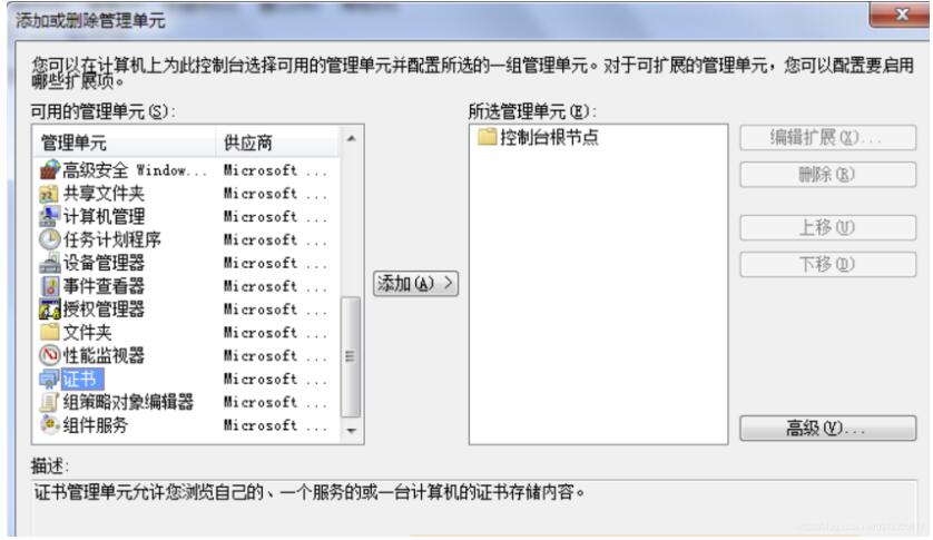 4.选择证书 → 添加 → 计算机账户(其他的保持默认,一直下一步)